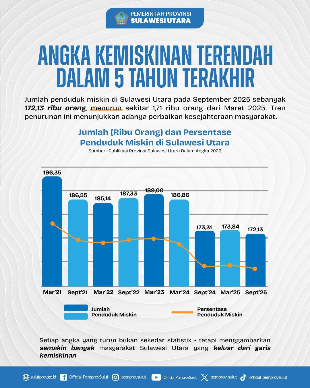 Per September 2025, jumlah penduduk miskin di Sulut tercatat sebanyak 172,13 ribu orang—menyusut sekitar 1,71 ribu orang hanya dalam kurun waktu enam bulan sejak Maret 2025. Ini adalah angka kemiskinan terendah dalam lima tahun terakhir.