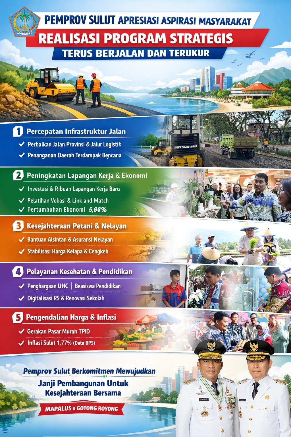 “Pemerintah Provinsi Sulawesi Utara berkomitmen mengubah janji pembangunan menjadi realitas yang menyentuh langsung kehidupan rakyat. Dengan semangat Mapalus, kita jaga momentum pertumbuhan ini untuk Sulut yang lebih maju,” ujar Gubernur dalam pernyataan resminya.
